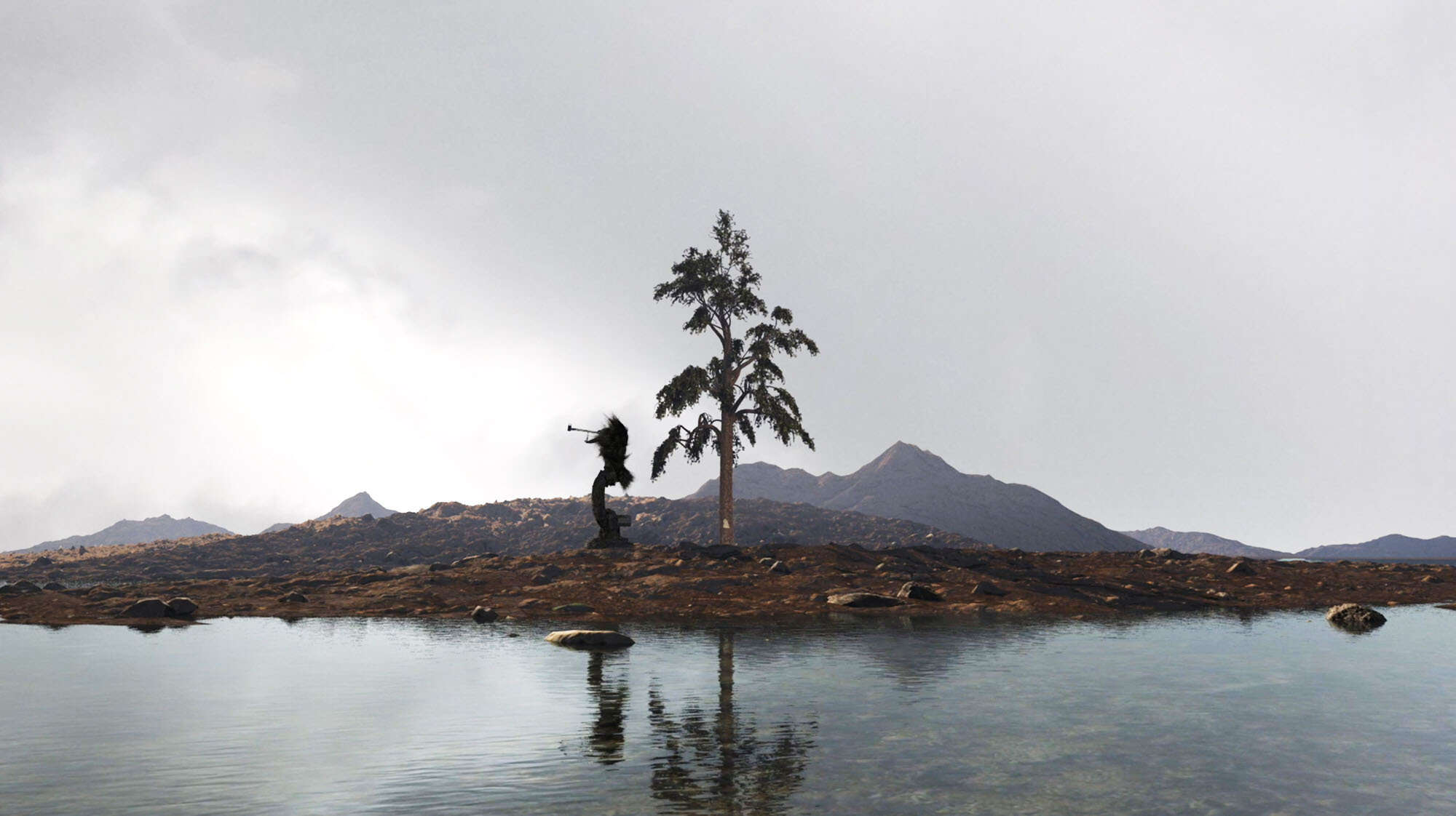 In an immersive spatial installation specially conceived for the MAK, the artist collective Troika (Eva Rucki, Conny Freyer and Sebastian Noel) focuses on the multi-layered forms of non-human intelligence. While in the digital animation "Terminal Beach" a robotic arm covered in fur fells the last tree on earth, the scenography is expanded into the real space by 3D-printed digital twins of museum objects that populate a flooded landscape as enigmatic creatures.