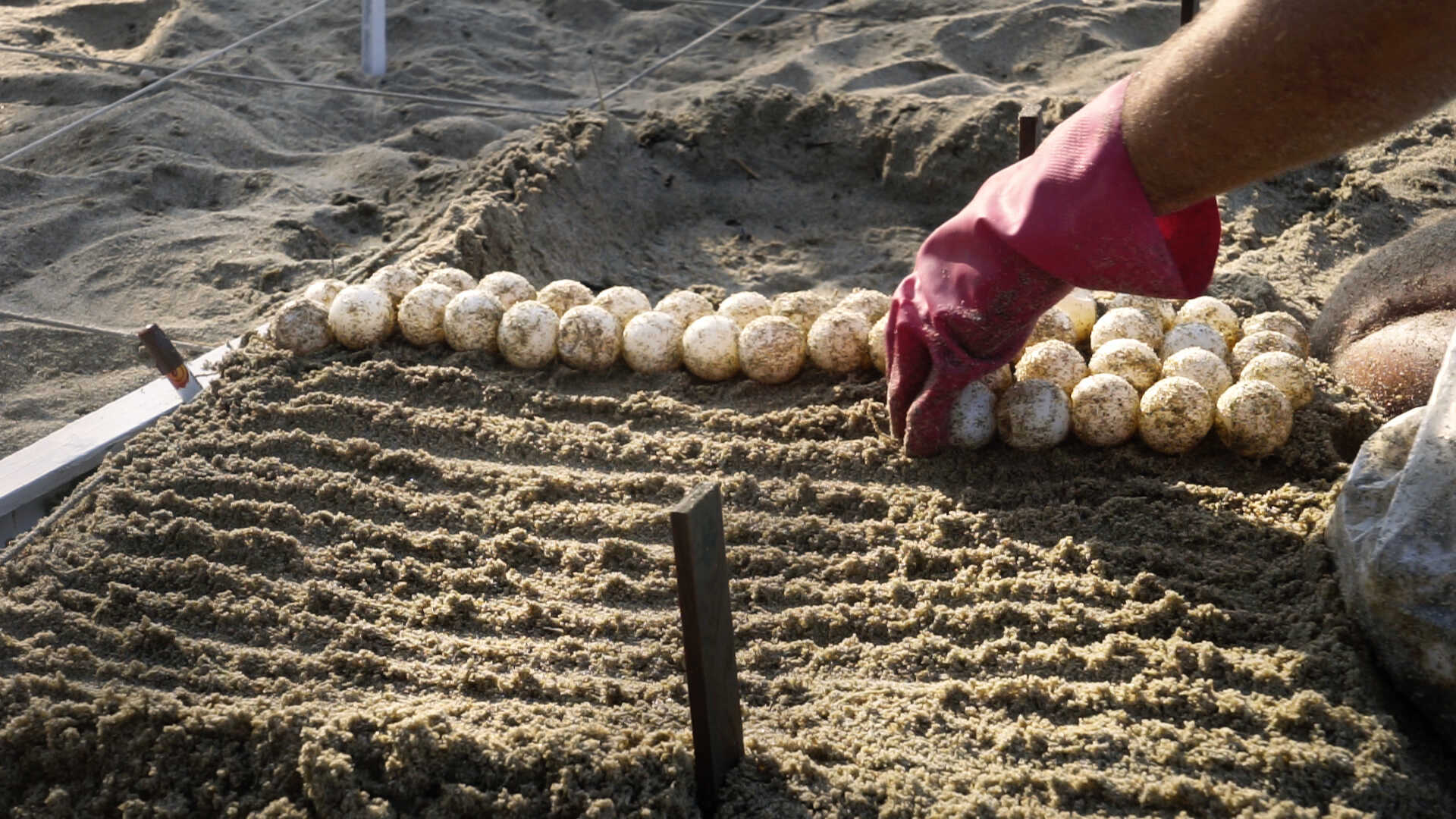 In his installation, Raphael Reichl portrays two conflicting dynamics in the Mexican harbour region „Puerto Escondido“. At the centre are hideaways, places of refuge and breeding sites that are being transformed or destroyed by global capitalism. Reichl shows labourers who build hideaways for tourists under precarious conditions. At the same time, a young woman creates small refuges for turtles with her bare hands: she digs sand nests in order to protect the turtle eggs.