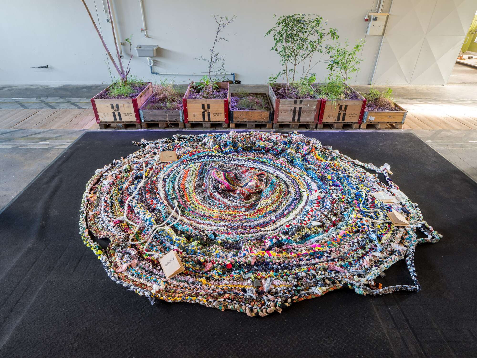 Ivana Lazić‘s immersive work invites visitors to literally be in becoming with the installation. The artist covers the floor with large blankets made from the wool of Pramenka sheep. She compares the migration processes of human and non-human animals. Lazić‘s work deals with transformations: the sheep‘s lifetime, which has gone into growing the wool, is transformed into warmth that visitors can feel when they wrap themselves in the blankets.