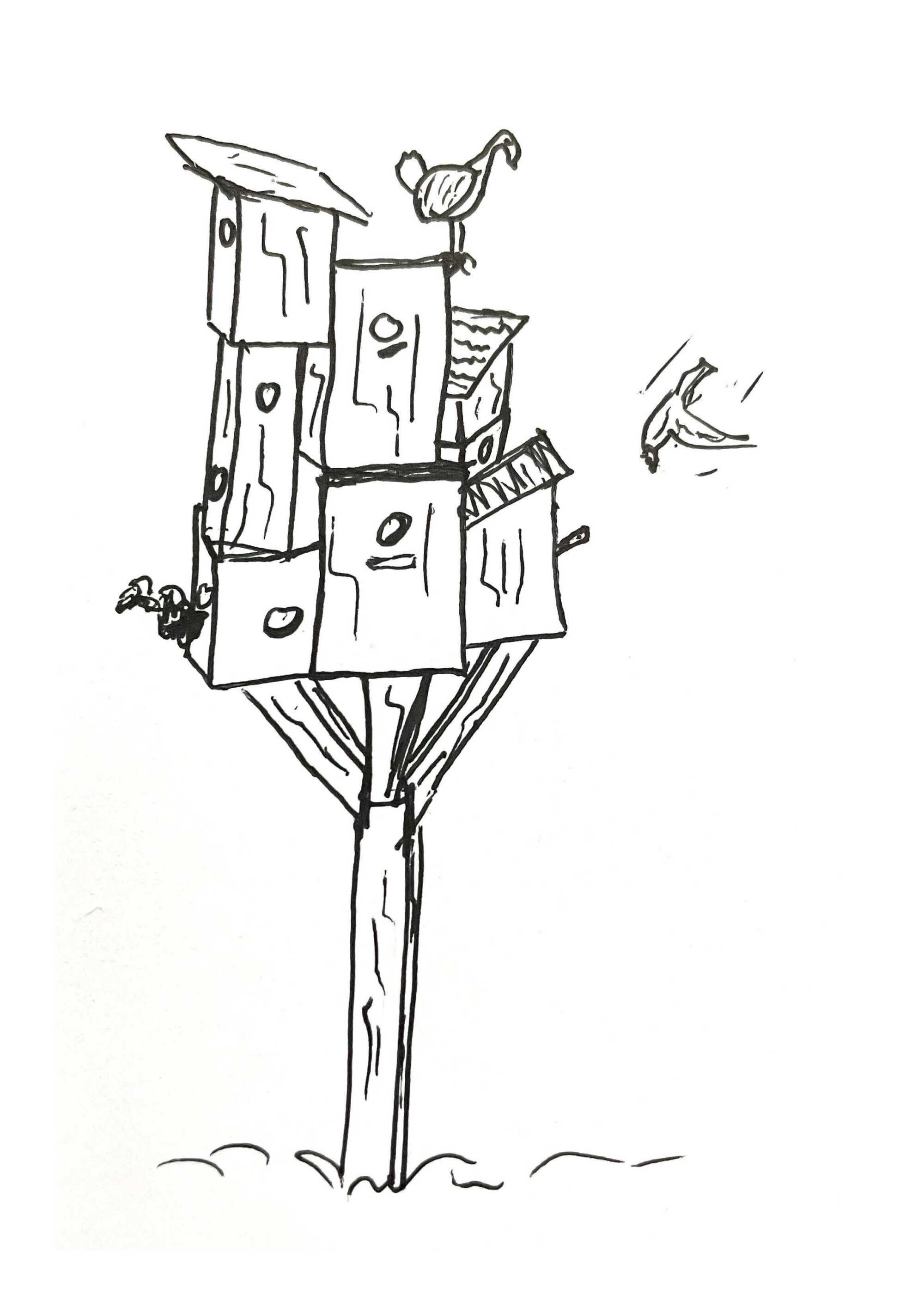 The „Mehrparteienvogelhaus“ presents a combination of art and nature. With several separate nesting sites and feeding areas, the sculpture provides a habitat for different bird species. The choice of entrance hole sizes allows for a specific attraction of those birds that feel comfortable in urban areas.