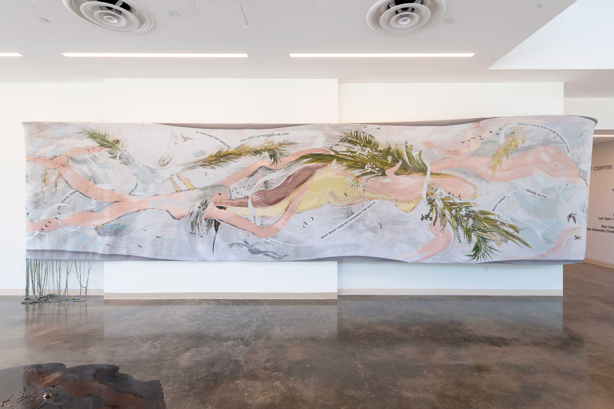 The large wool tapestry with hand-sewn individual threads, Flying Mother (The Bird Ban Her) connects bird migration, air and weightlessness with a sense of nurture and sensuous, archetypal femininity. Guiding visitors along a frieze-like narrative, the work demonstrates continuity rather than disconnection between humans and non-humans, suggesting that communication, devotion and responsibility precede and exceed the possibilities of symbolic language. Nevertheless, as bird migration routes are increasingly disrupted by the effects of anthropogenic climate change, a melancholia settles, as we part from the tapestry with the words “most birds travel alone.”