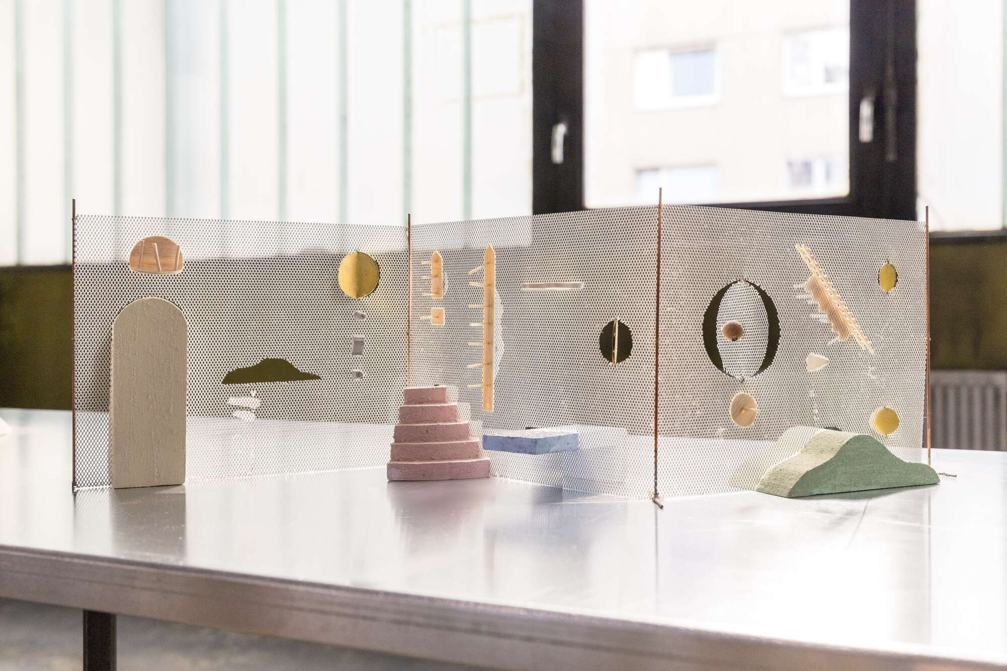 Styrofoam, acrylic paint, steel, transparent paper, wood, 108×143.5×18.5 cm